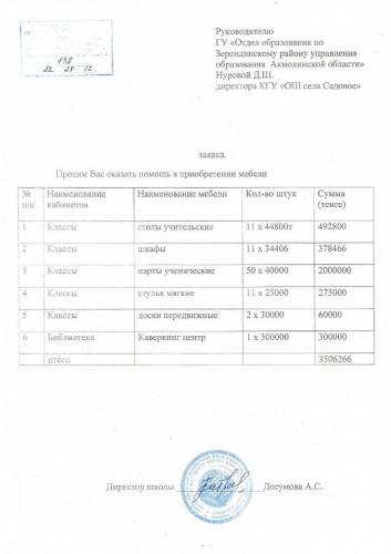 Заявка на мебель на модернизации школы
